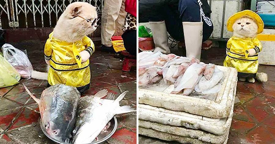 Có một con mèo đặc biệt ở chợ Hải Phòng, Việt Nam. Nó không phải tới đây để trộm cá làm đồ ăn, nhìn bộ quần áo tươm tất của hắn và quầy bán cá trước mặt, ngươi có hiểu thân phận của nó không? Nó thực sự là một người bán hàng rong nhỏ.