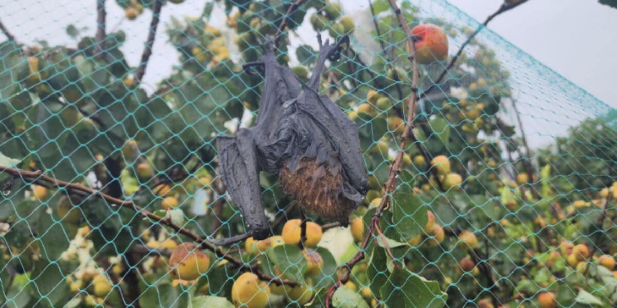 “Jonah’s weakened state made the rescue relatively easy,” Vintin said. “I carefully cut the netting around him using scissors, folded him into a bat wrap to mimic the safety of his mother’s wings, and placed him in a carrier before removing the remainder of the illegal netting from the fruit tree.”