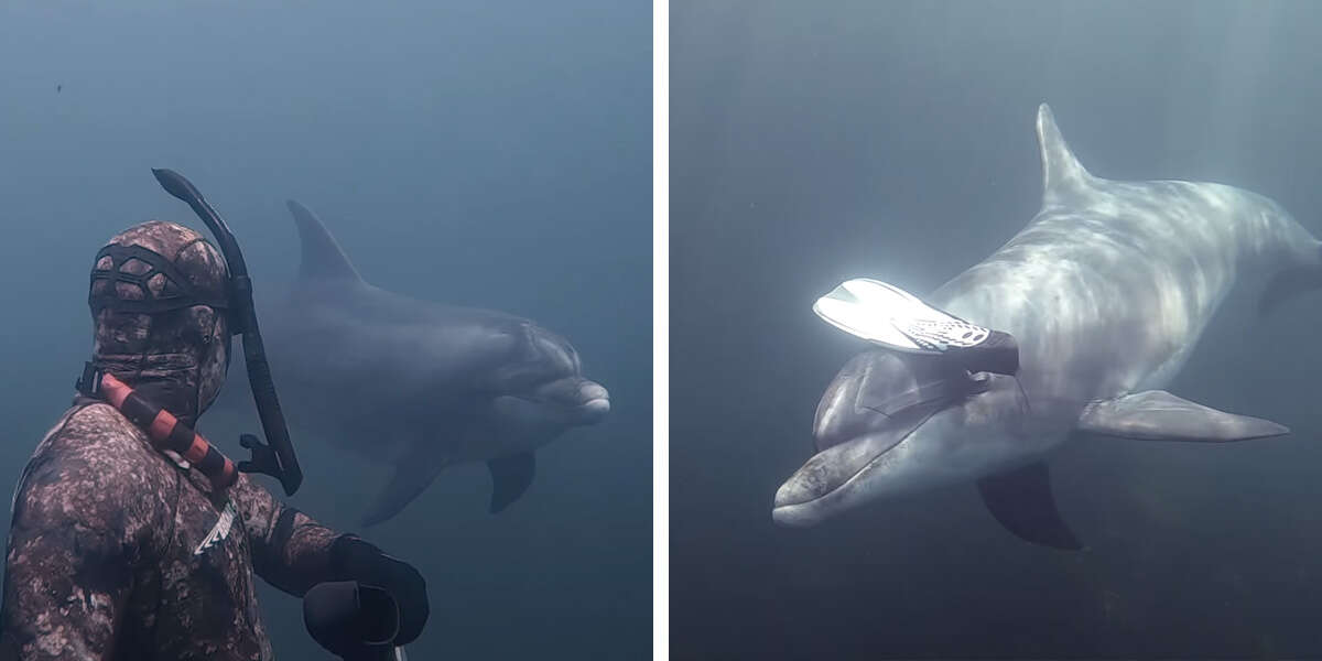The next day, when he returned to the water, Dusty appeared carrying another fin she’d found. It was a gift — and with it, the friendly pair then played a game akin to fetch.