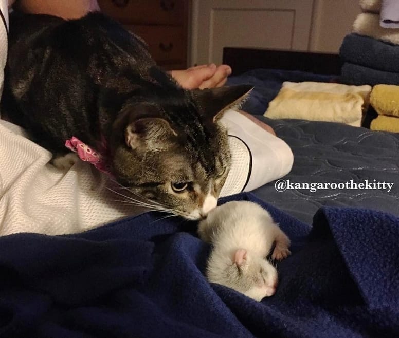 Khi Kanga gặp Joey lần đầu tiên, cô ngay lập tức đánh hơi thấy chú mèo con nhỏ bé trước khi bắt đầu liếm nó. Đó là tình yêu từ cái nhìn đầu tiên. Đến nỗi Kanga không bao giờ xa người bạn mới của mình. Một tình bạn rất đẹp rõ ràng là rất tốt cho Joey, người đang dần tăng cân và sức mạnh.