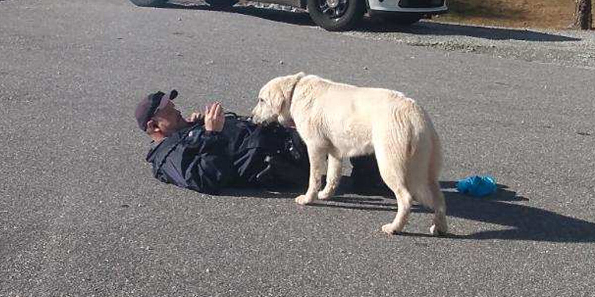 Rather than pursue the dog, Holcom found a way to make her come to him. He laid down on the ground as though he had collapsed, inspiring her to check on him.