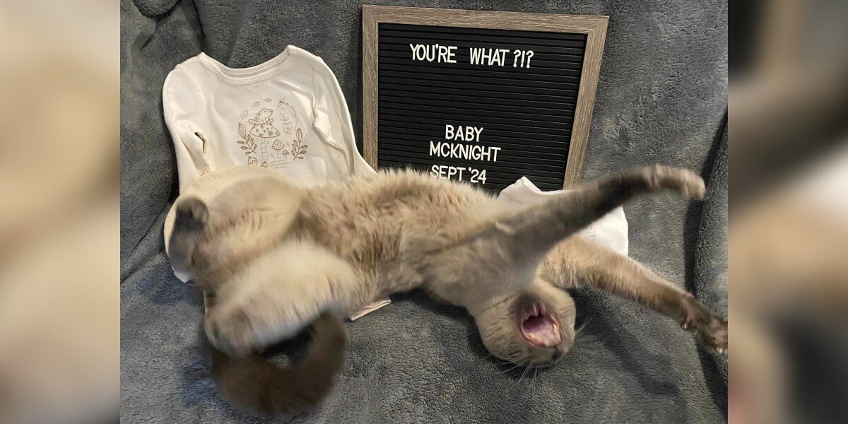 In the photos, the cats full-on look like they’re throwing a tantrum when finding out about their new baby sister. It’s such a funny pregnancy announcement, and the couple is thrilled with the results of the very chaotic photo shoot.