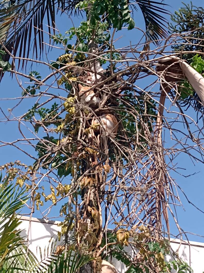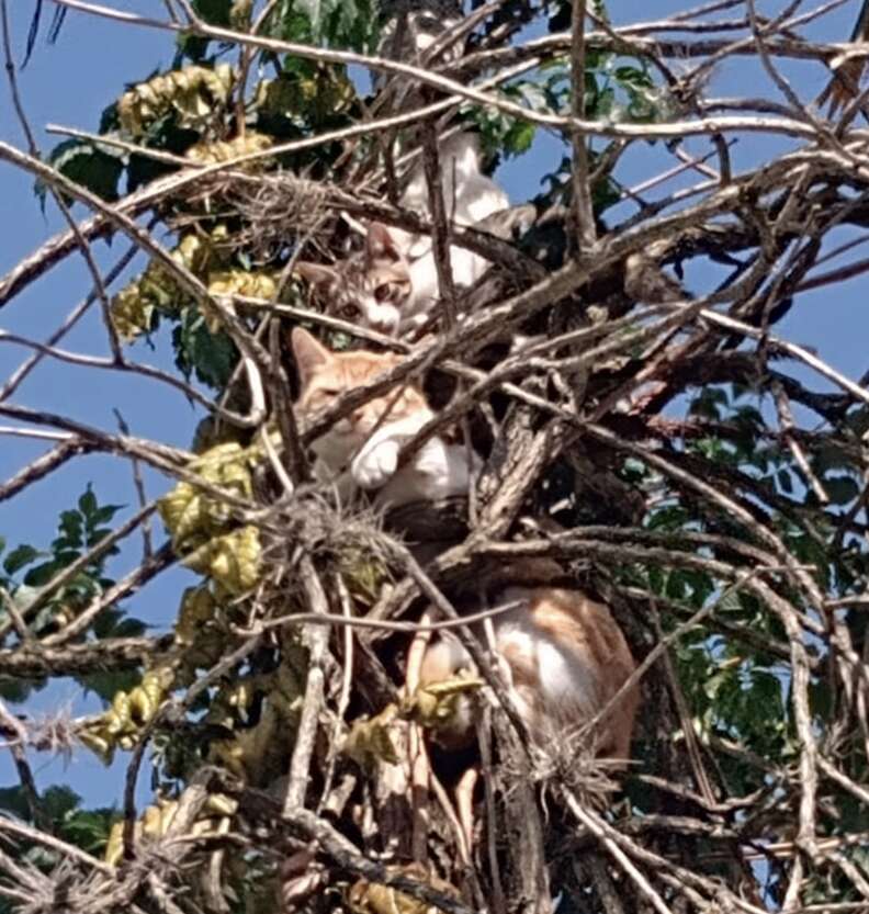 Trong những cành cây lởm chởm của một cái cây gần đó, thực sự có nhiều khuôn mặt đang nhìn chằm chằm vào cô. Chúng là những con mèo hàng xóm, có vẻ hơi ngạc nhiên khi người canh gác cao cả của chúng thực sự đã bị nhìn thấy.