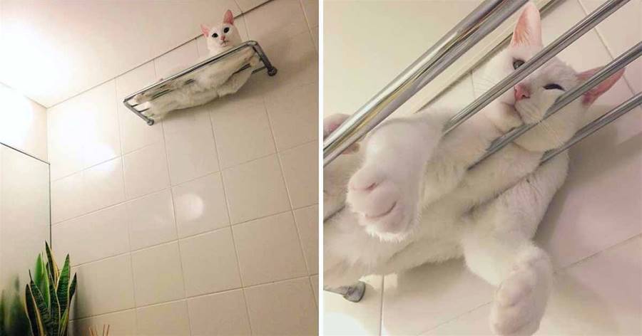 Người quảng cáo có một con mèo trắng, ngày hôm đó khi anh ấy bước vào phòng tắm để tắm, anh ấy chợt nhận thấy có thứ gì đó trên giá treo khăn tắm. Hóa ra con mèo đang nằm đó nhìn mình, thịt trên bụng con mèo tràn ra khỏi khe hở, giống như một chiếc “khăn gấp”.