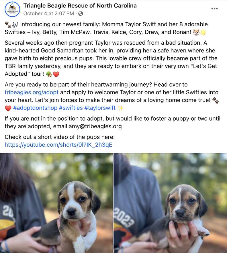 Momma Taylor Swift was rescued from a “Treacherous” situation and was saying, “Today Was A Fairytale,” when she was taken somewhere safe before her babies were born. She’s now the proud mama of Ivy, Betty, Tim McPaw, Travis, Kelce, Cory, Drew and Ronan. They’re all doing well and living in a “State of Grace” waiting for their forever families to find them.