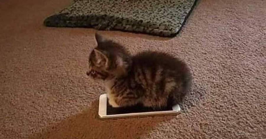 Một chú mèo nhỏ nhắn đang ngồi xổm trên chiếc điện thoại di động to bằng chính mình, như đang giữ ấm, trông siêu đáng yêu ~